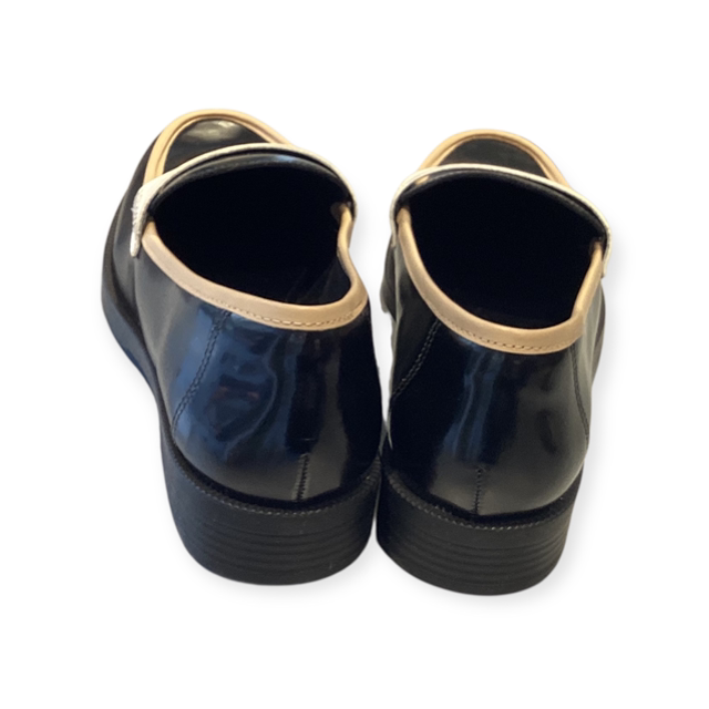 Mocasines piel cepillada negra combinada con napa de dos colores, beige y blanco roto.