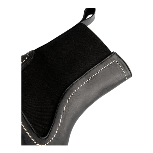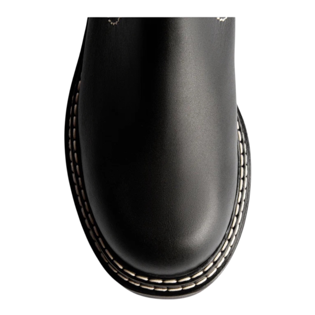 Botín Chelsea de cuero negro con detalles de costuras blancas.