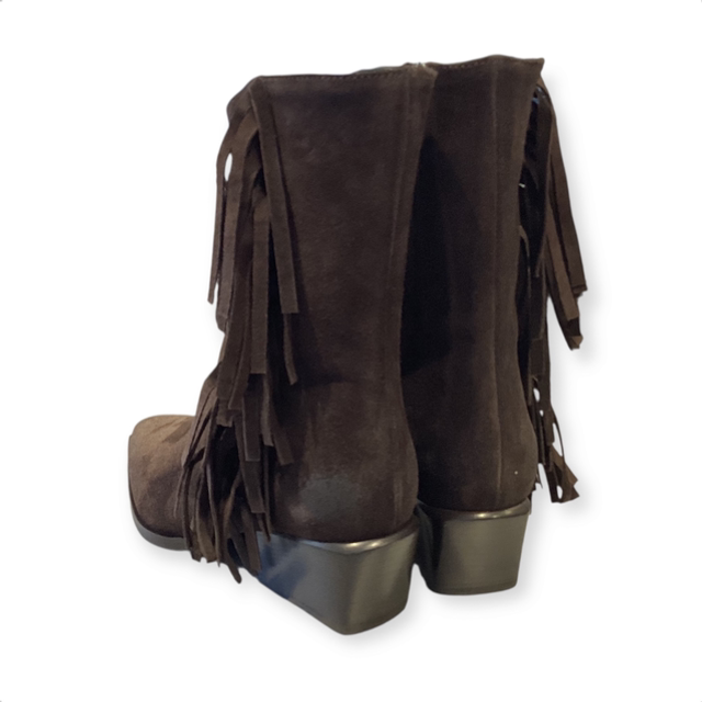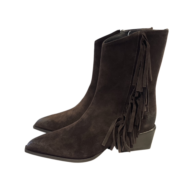Hechos a mano en Italia con ante marrón oscuro, estos botines le dan a la silueta occidental un toque moderno y listo para la ciudad. La puntera puntiaguda añade elegancia y alarga el pie, mientras que la parte superior limpia con costuras mínimas mantiene el aspecto elegante. Un tacón de bloque en ángulo de altura media proporciona una elevación cómoda, y la cremallera lateral completa garantiza un fácil uso. Acabado con forro de cuero y suela de goma duradera.